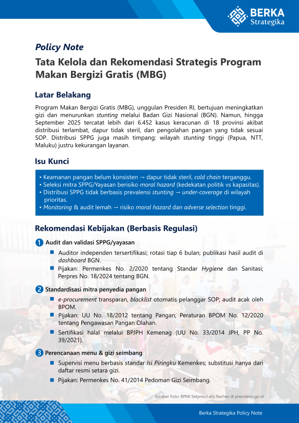 Selain itu, penguatan rantai pasok perlu dilakukan baik dari sisi kuantitas maupun kualitas. Dari sisi kuantitas, penjaminan pasokan diarahkan pada akselerasi kapasitas pelaku usaha penyedia, khususnya sektor pertanian dan perikanan, melalui kebijakan dan dukungan teknis lintas sektor agar ketersediaan bahan baku MBG tetap konsisten tanpa menekan pasar pangan reguler. Sementara dari sisi kualitas, perlu diterapkan validasi ketat, mekanisme e-procurement yang transparan, serta pengendalian ketat terhadap implementasi SOP dan standar yang telah ditetapkan. Seluruh proses produksi hingga distribusi harus distandardisasi melalui kepatuhan SOP, dashboard publik real-time, serta protokol kontingensi agar mutu pangan tetap terjaga sekaligus memperkuat kepercayaan publik terhadap program ini. Beberapa langkah mitigasi yang direkomendasikan:
